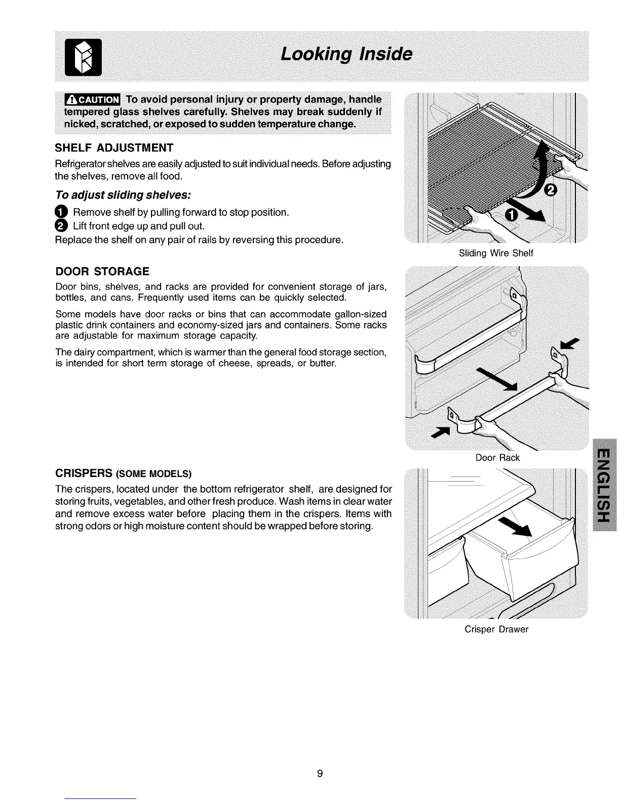 Refrigerator shelves are easily adjusted tosuit individual needs. Before adjusting