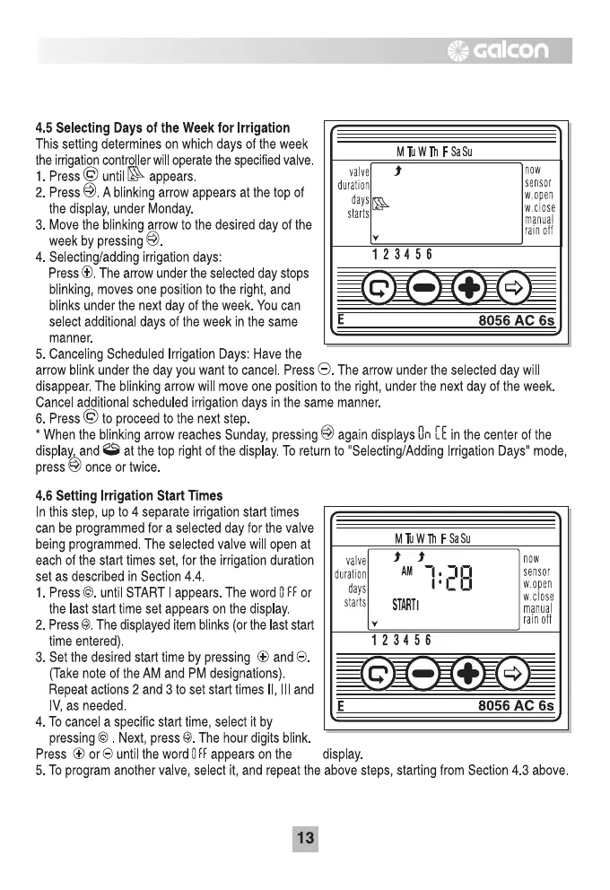 Galcon AC 6S - Selecting Days of the Week for Irrigation; Setting Irrigation Start Times