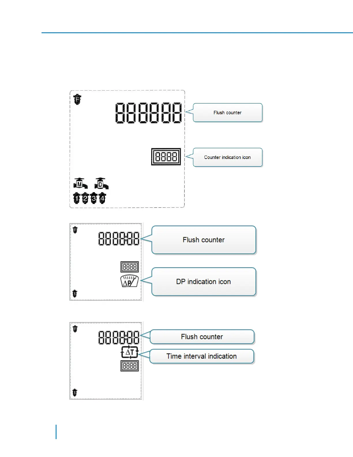 l Second screen - displays the number of flush cycles triggered by a DP signal: