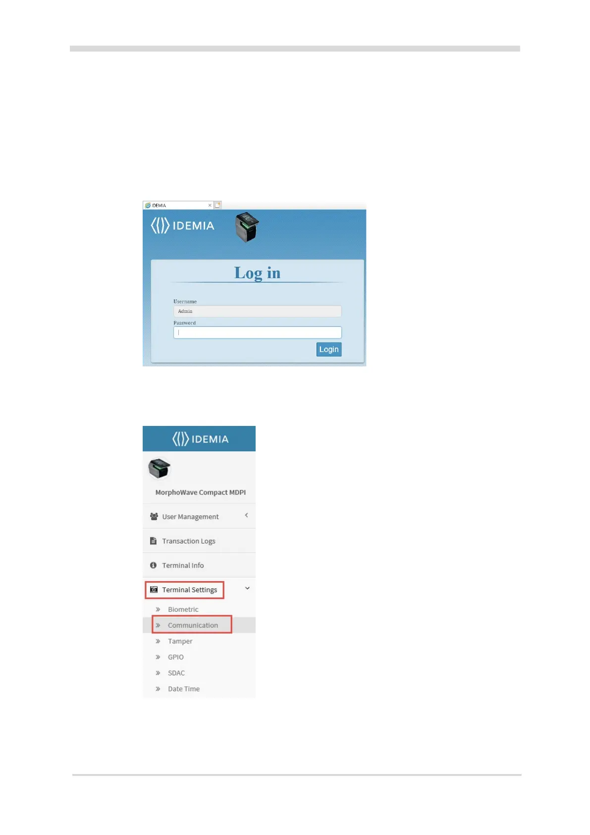 The IDEMIA Log in screen displays. The reader type will determine what Morpho reader icon