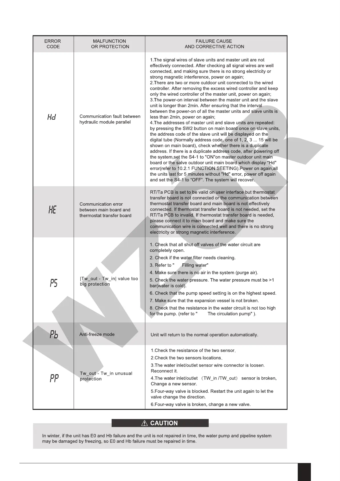 Galmet Prima - Hd Communication fault between hydraulic module parallel; HE Communication error between main board and thermostat transfer board; Pb Anti-freeze mode; P5 |Tw_out - Tw_in| value too big protection