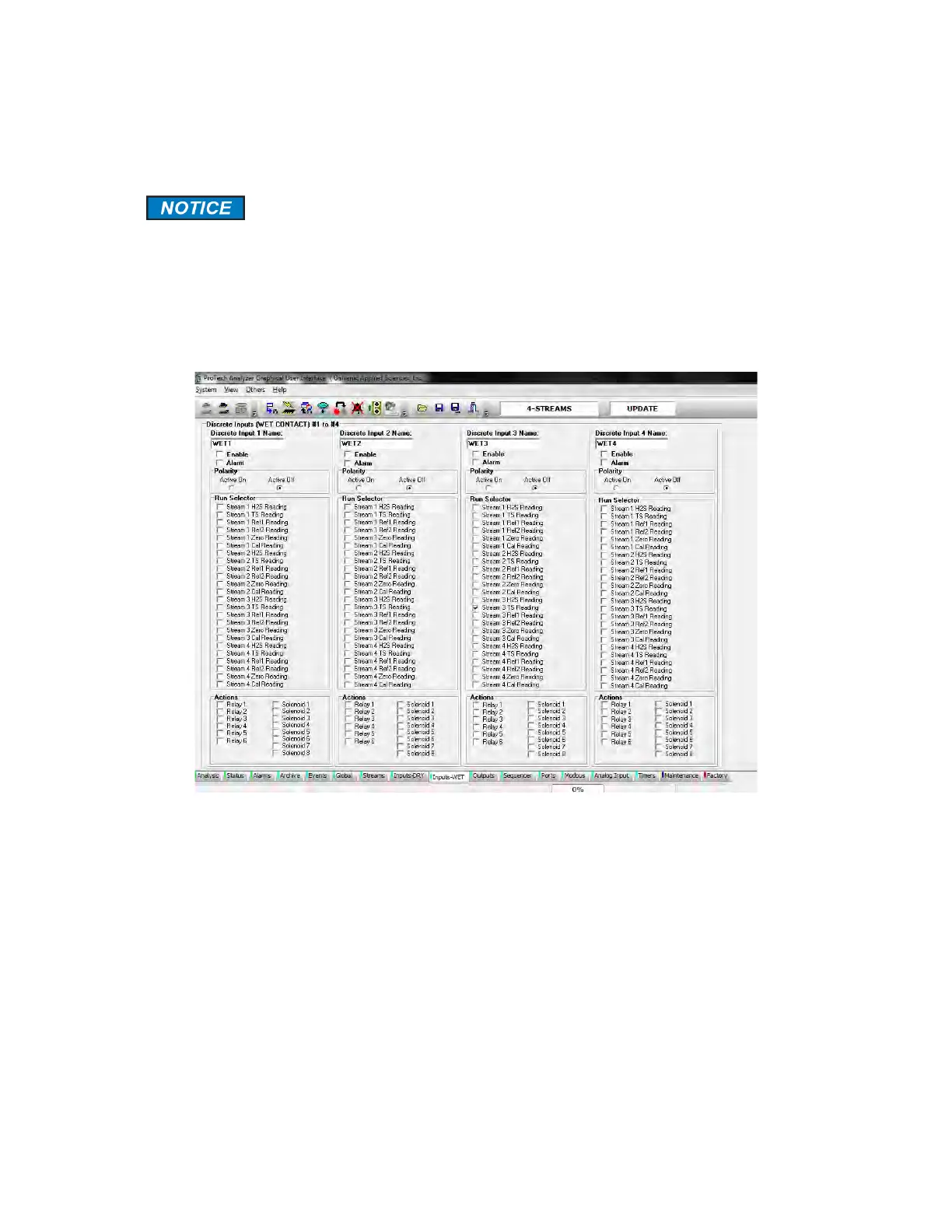 required for these inputs is 4 - 24 VDC. The Input - WET tab allows the user to configure
