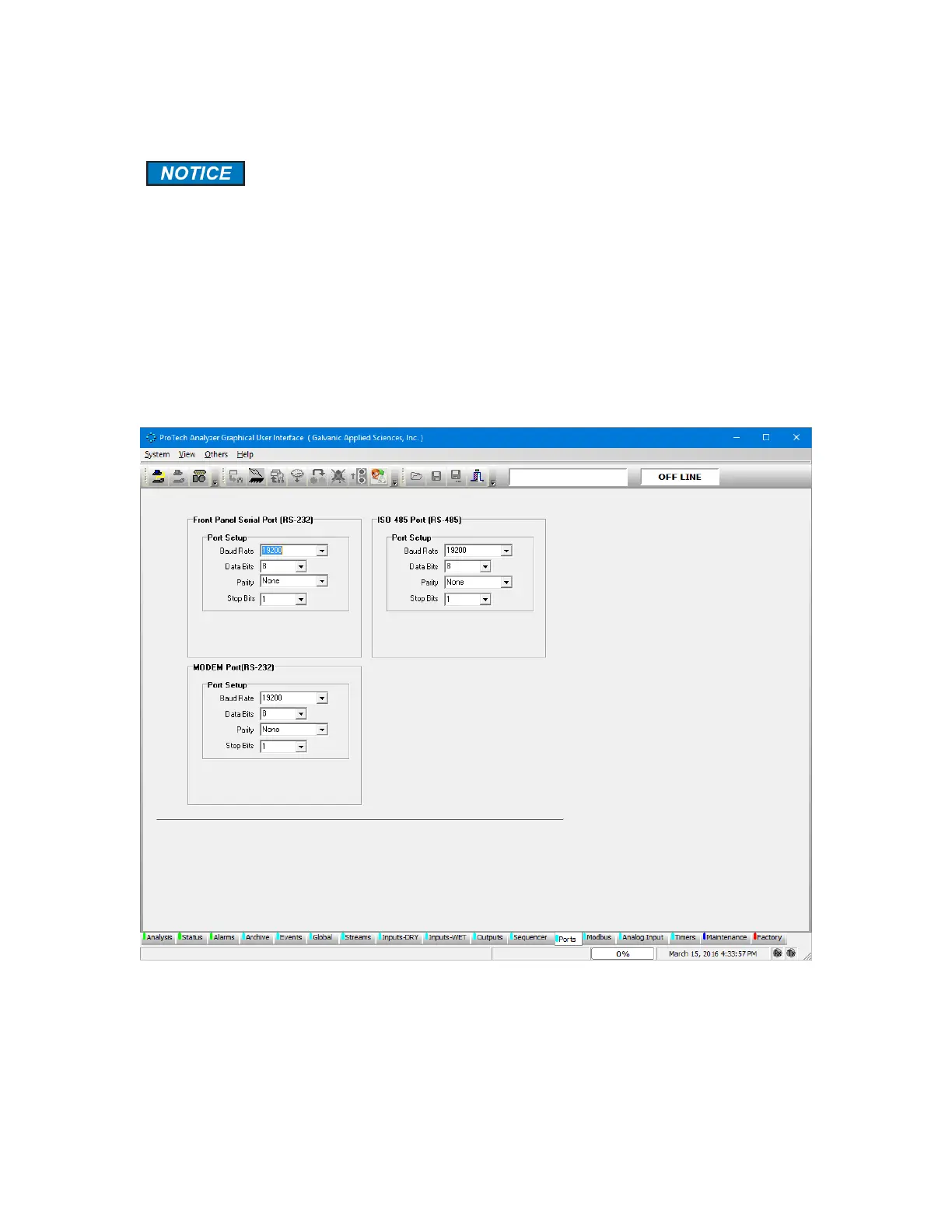 analyzer – the Front Panel Serial Port (RS-232), the ISO 485 Port (RS-485), and the MODEM
