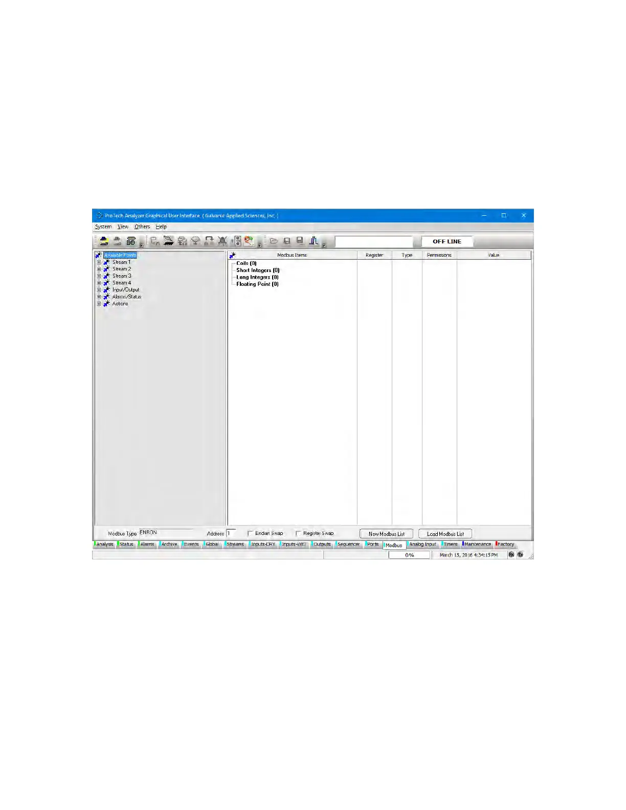 The Modbus tab allows the user to set up the analyzer to output data in 3 varieties of the