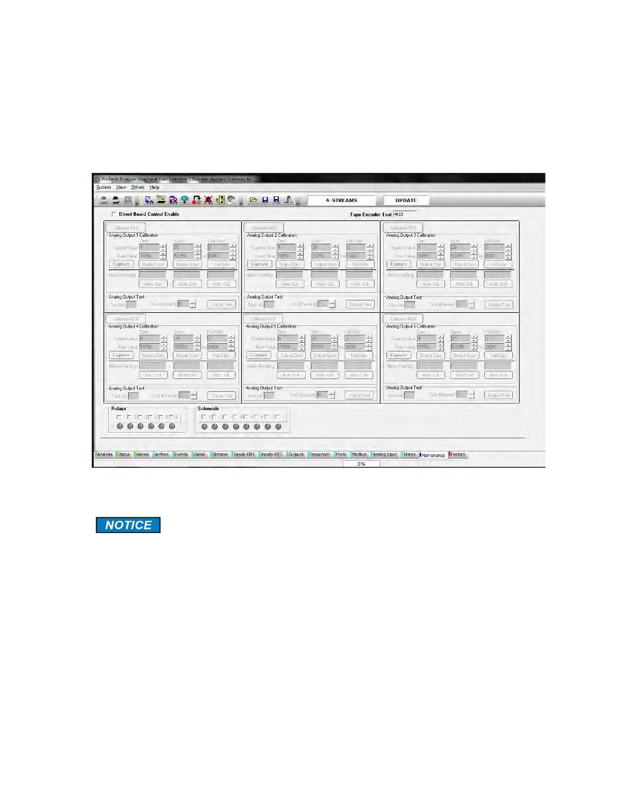 The Maintenance tab (Figure 5-41) allows the operator to calibrate the six analog outputs and