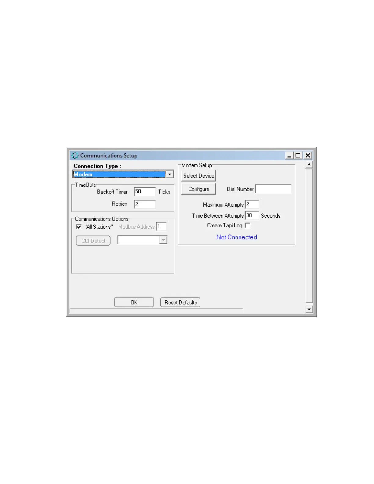 If the Modem option is selected, the Communications Setup dialog box will appear as in