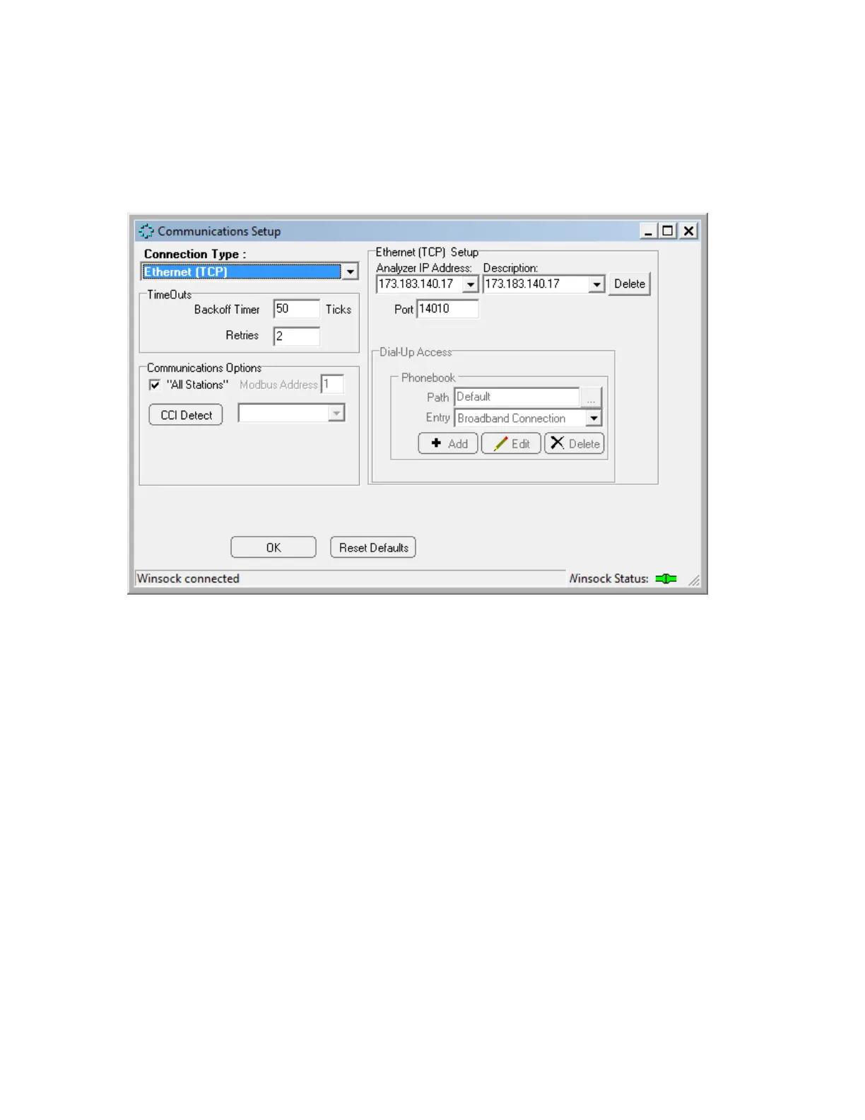 If the Ethernet option is selected for the connection type, the Communications Setup dialog