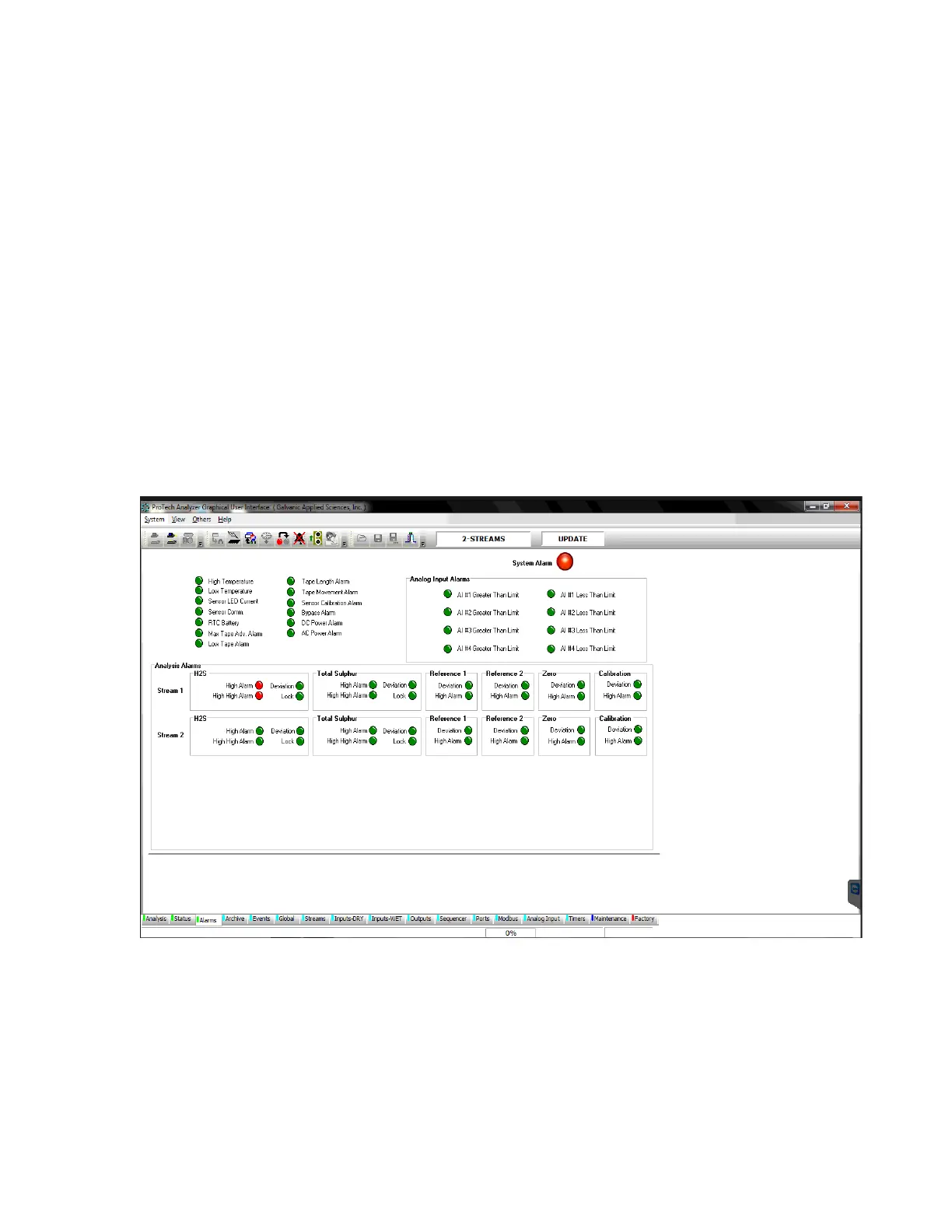 The Alarms tab allows the user to view the status of the analyzer alarms. Alarms such as the