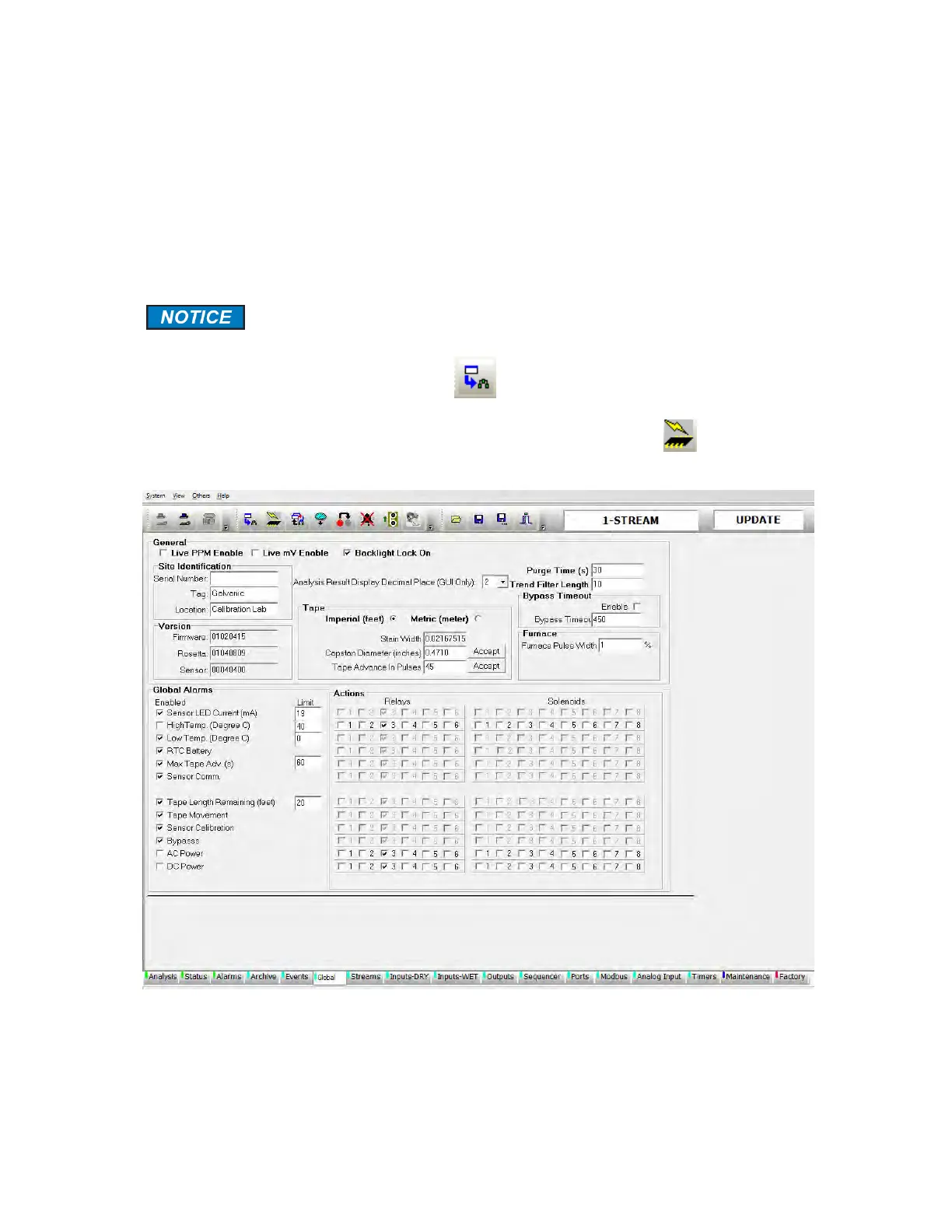 relays and solenoids. The Global screen is divided into two areas: