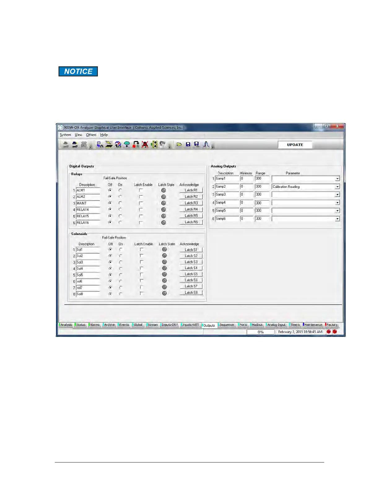 relays, 8 solenoids and 6 analog outputs. The Output tab is divided into 2 main sections:
