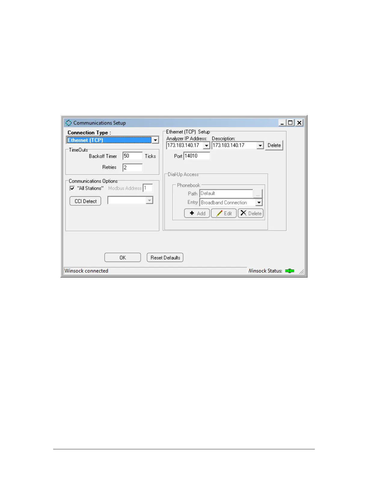 If the Ethernet option is selected for the connection type, the Communications Setup dialog