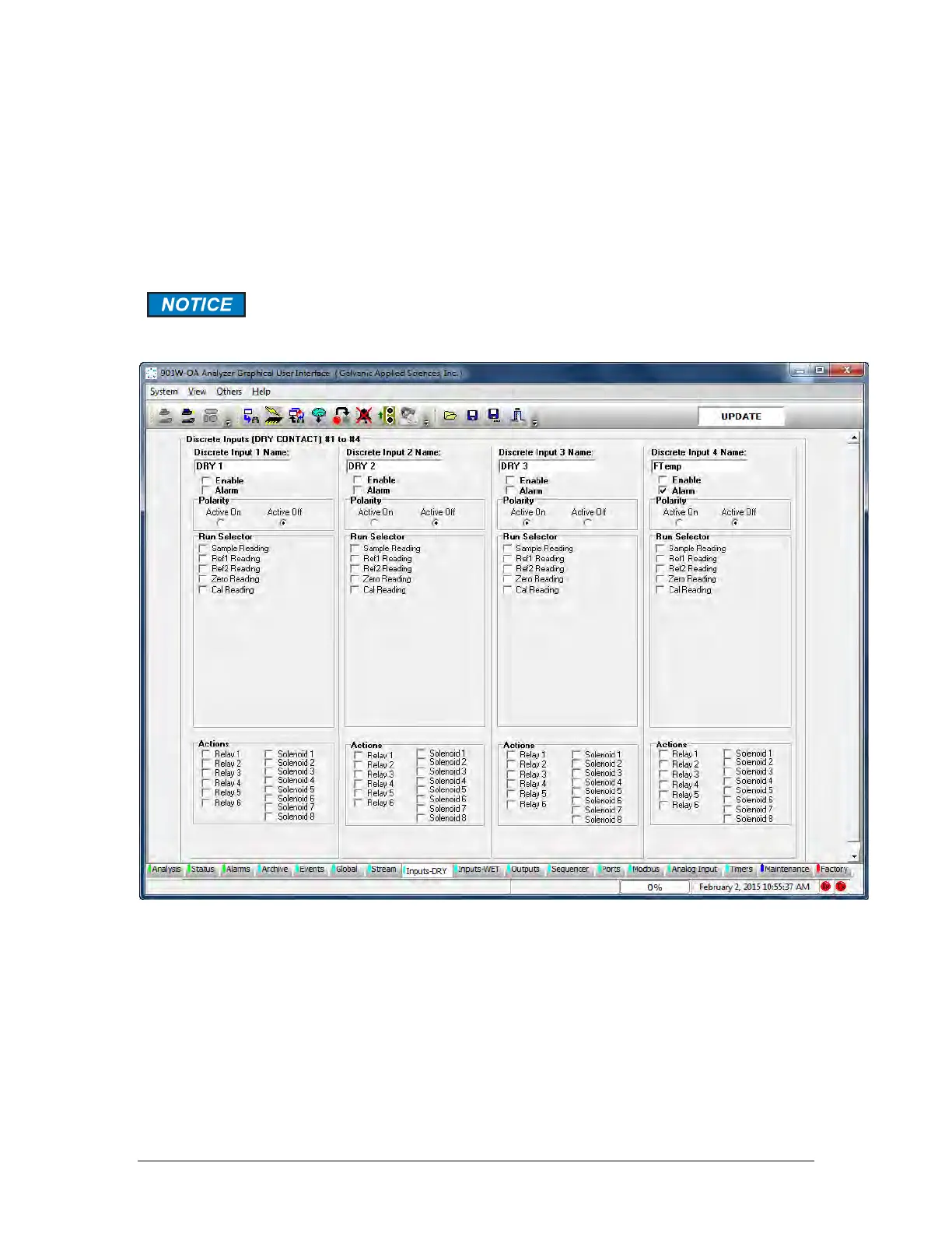 There are four dry contact discrete inputs on the analyzer. The Inputs - DRY tab allows the
