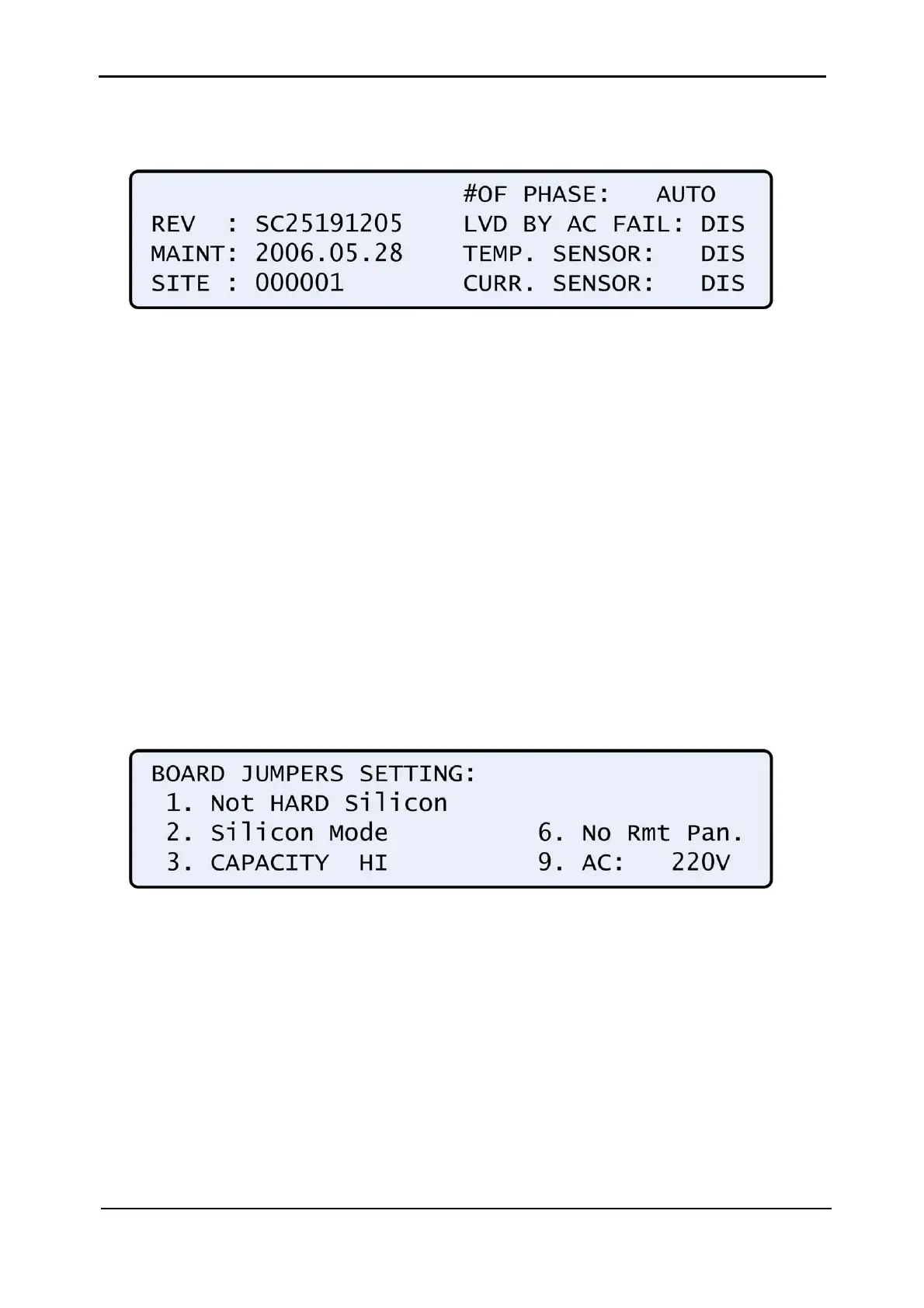 The screen presents status of controller board’s jumpers. See also section