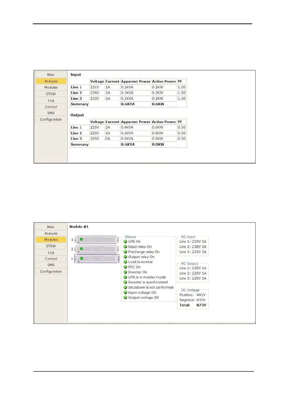 The “Modules” main menu option enables you to see readings for an individual UPS module.
