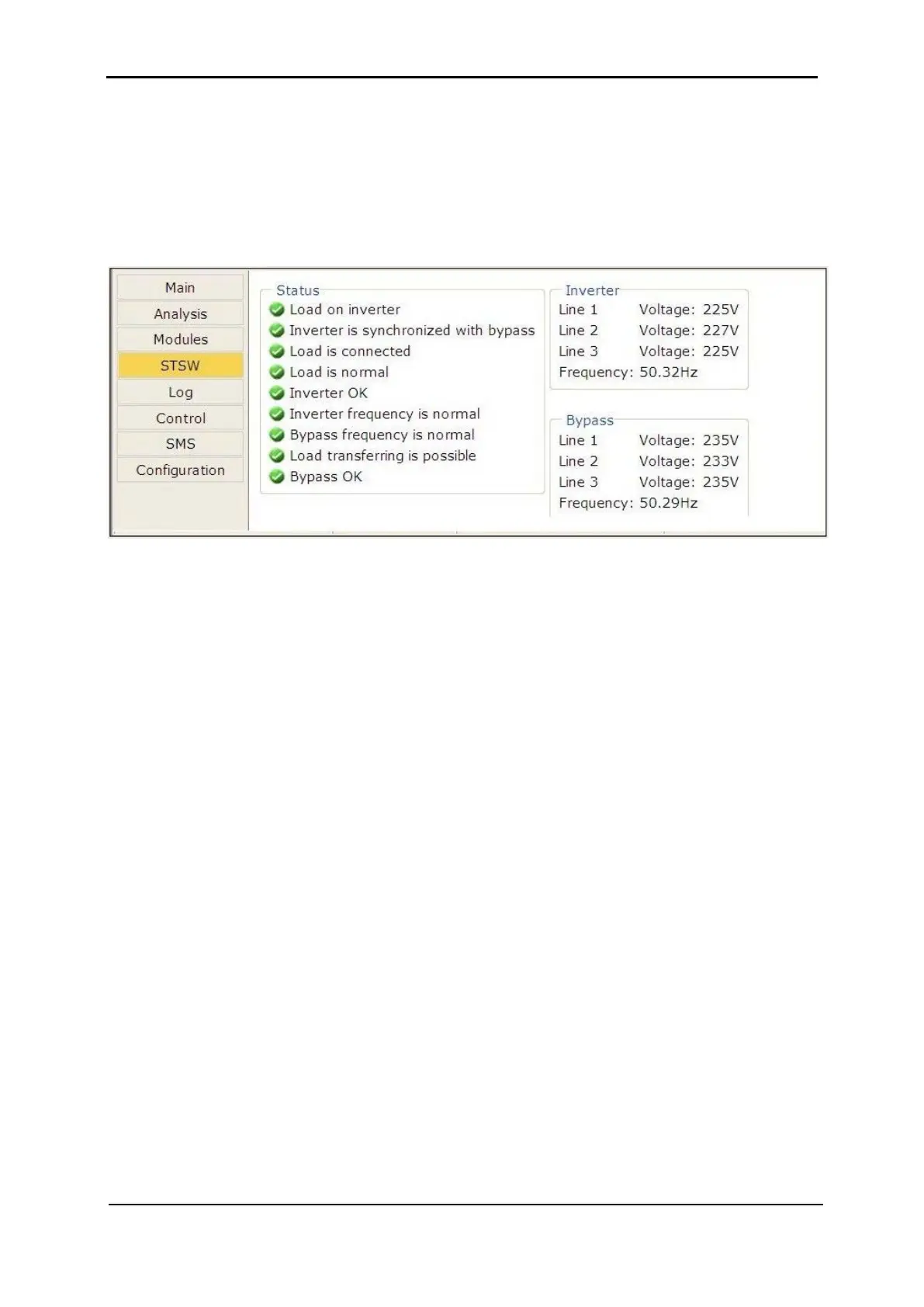 The “STSW” (Static Switch) option on the main menu displays the real-time voltage and