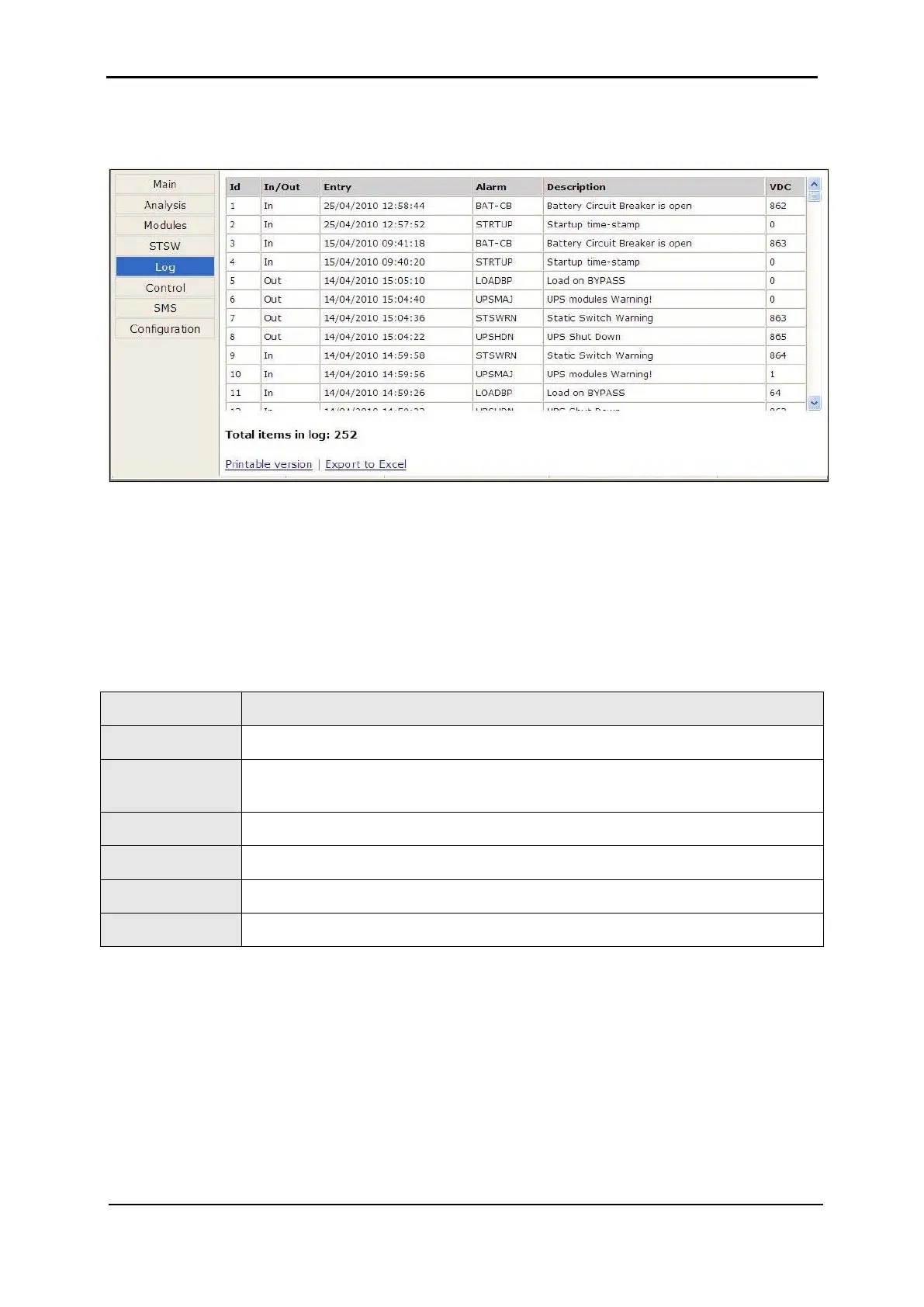 Table 15: Data items on the event log screen