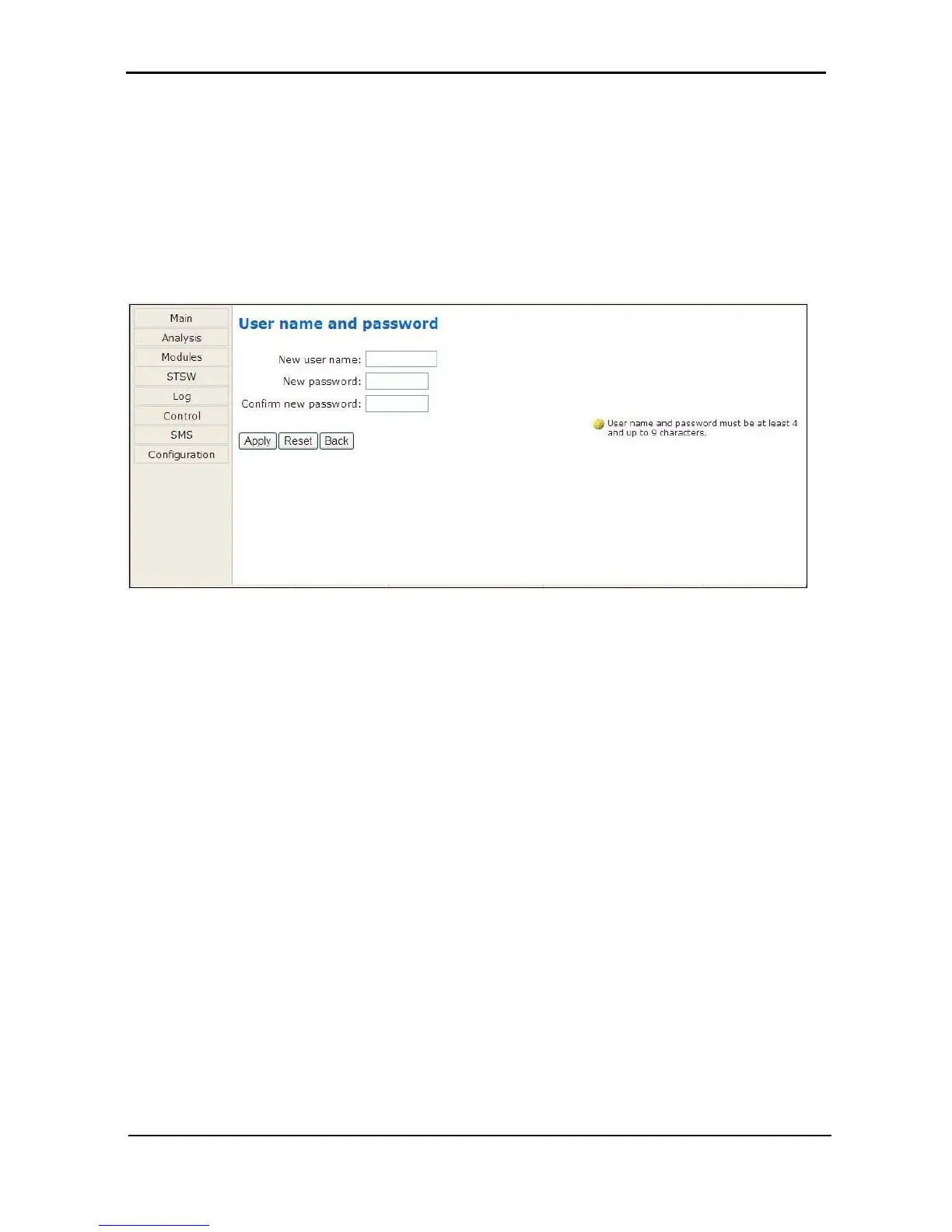 The “Set user name and password” on the Configuration submenu enables you to change the user-ID and