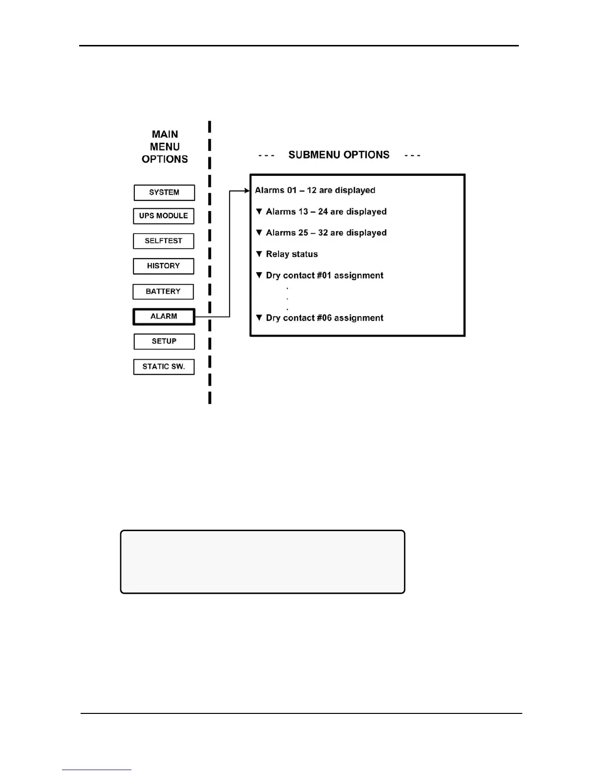 Gamatronic Power+ - Alarm Option; Figure 112: Main Menu Option 6 (Alarm); Figure 113: Alarms 01-12
