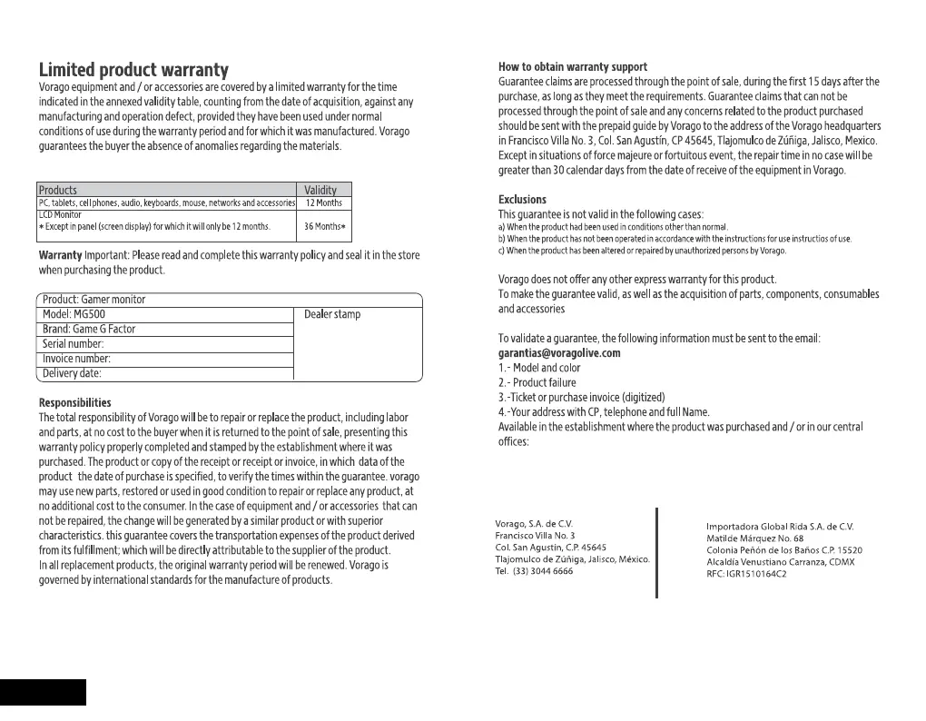 GameFactor MG500V2 - LIMITED PRODUCT WARRANTY; HOW TO OBTAIN WARRANTY SUPPORT; WARRANTY EXCLUSIONS