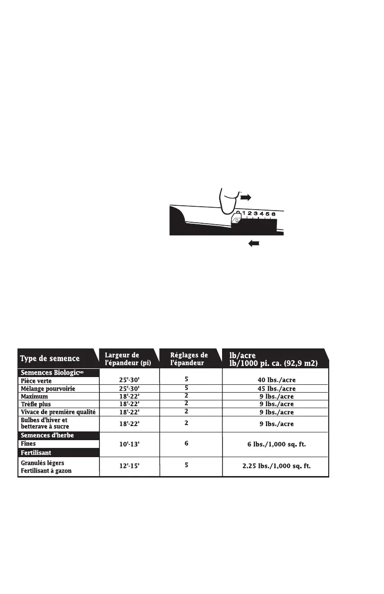 1) Identier le réglage approprié pour le type de graines/semences que vous répandrez à l’aide du tableau à la