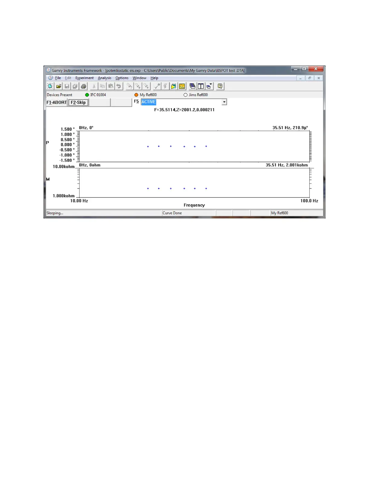 to run. The Reference 600 labeled My Ref600 has a red indicator because it is recording the EIS spectrum