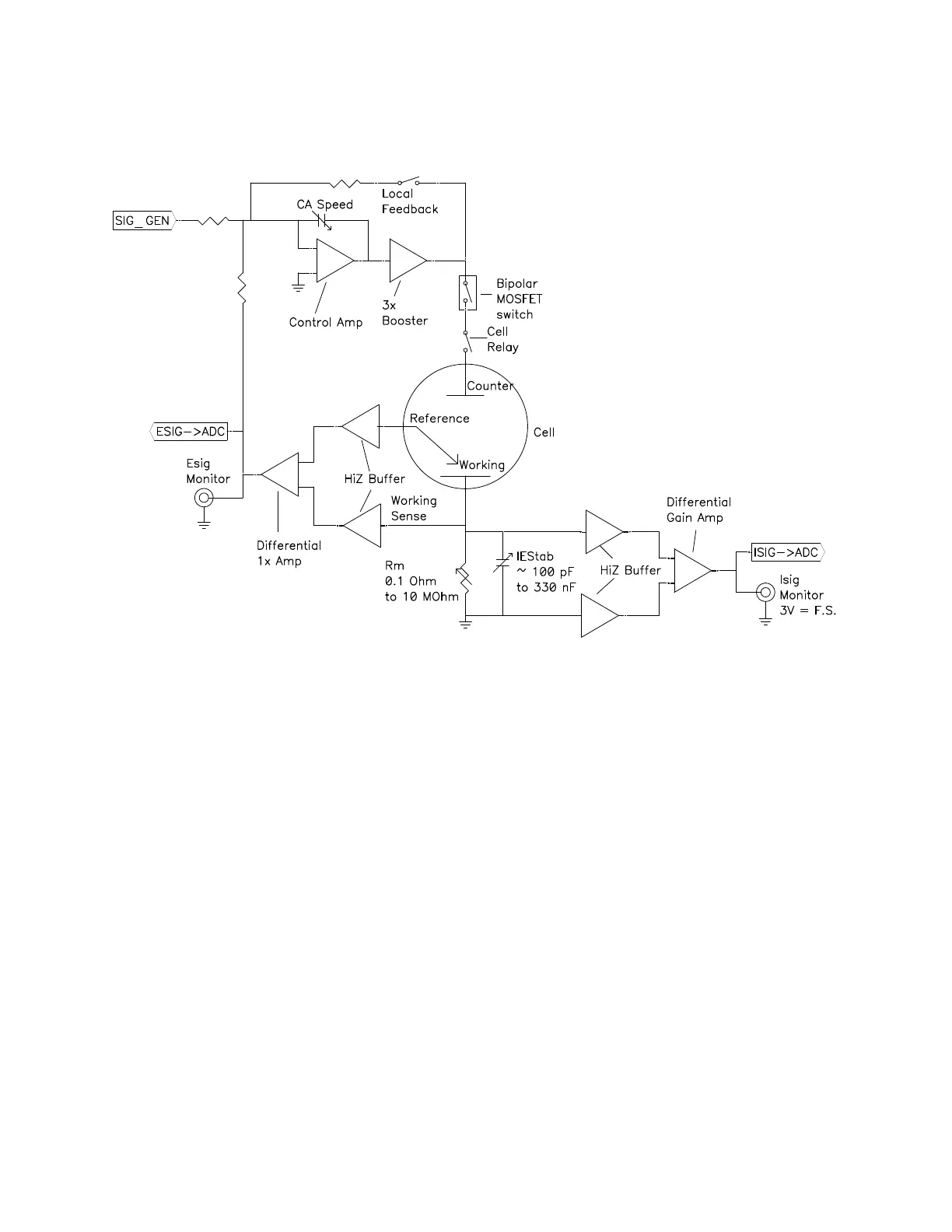 Only Potentiostat Mode circuitry is shown in this figure. In this mode the voltage difference between the