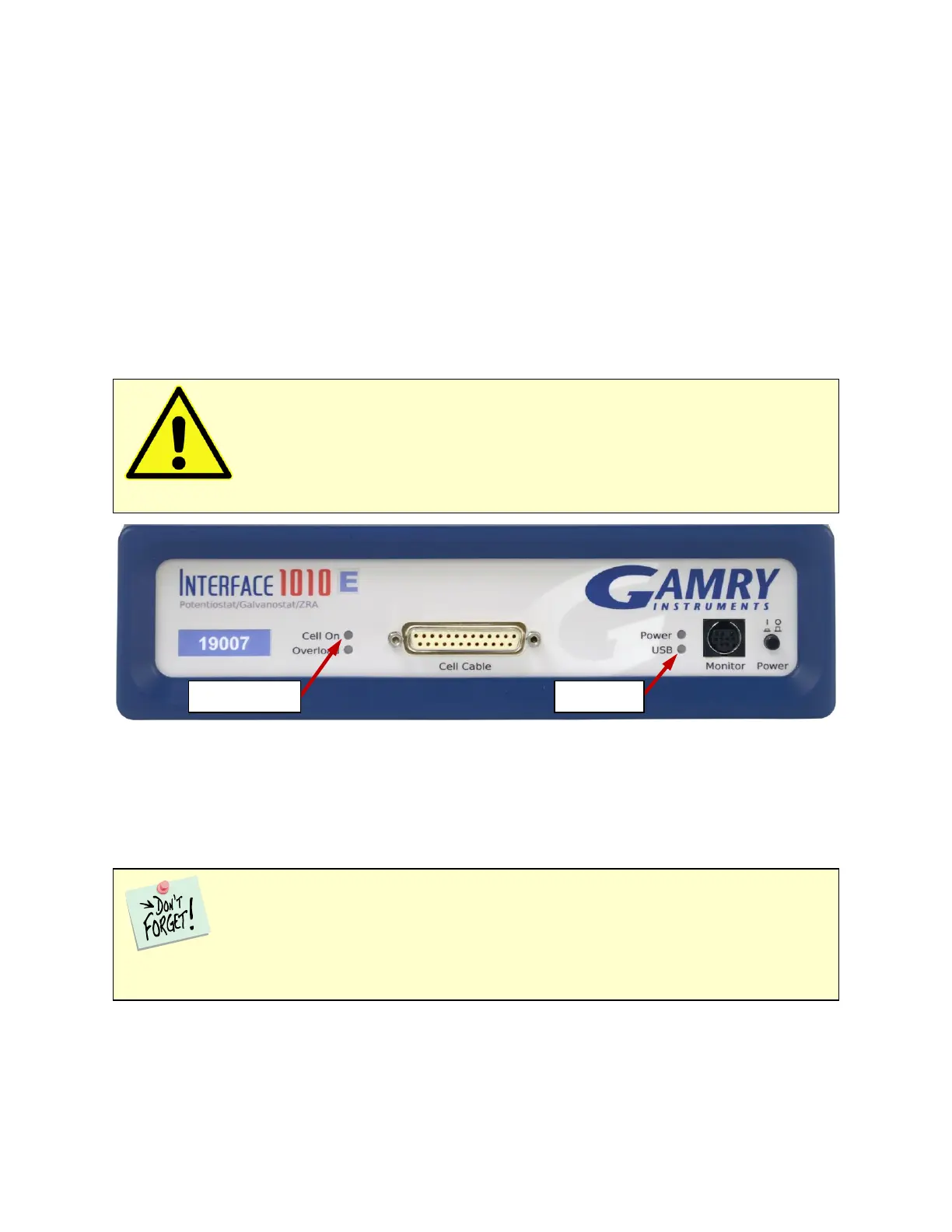 If you need to make changes to your cell leads, do so between experiments, when the Cell On LED is off and