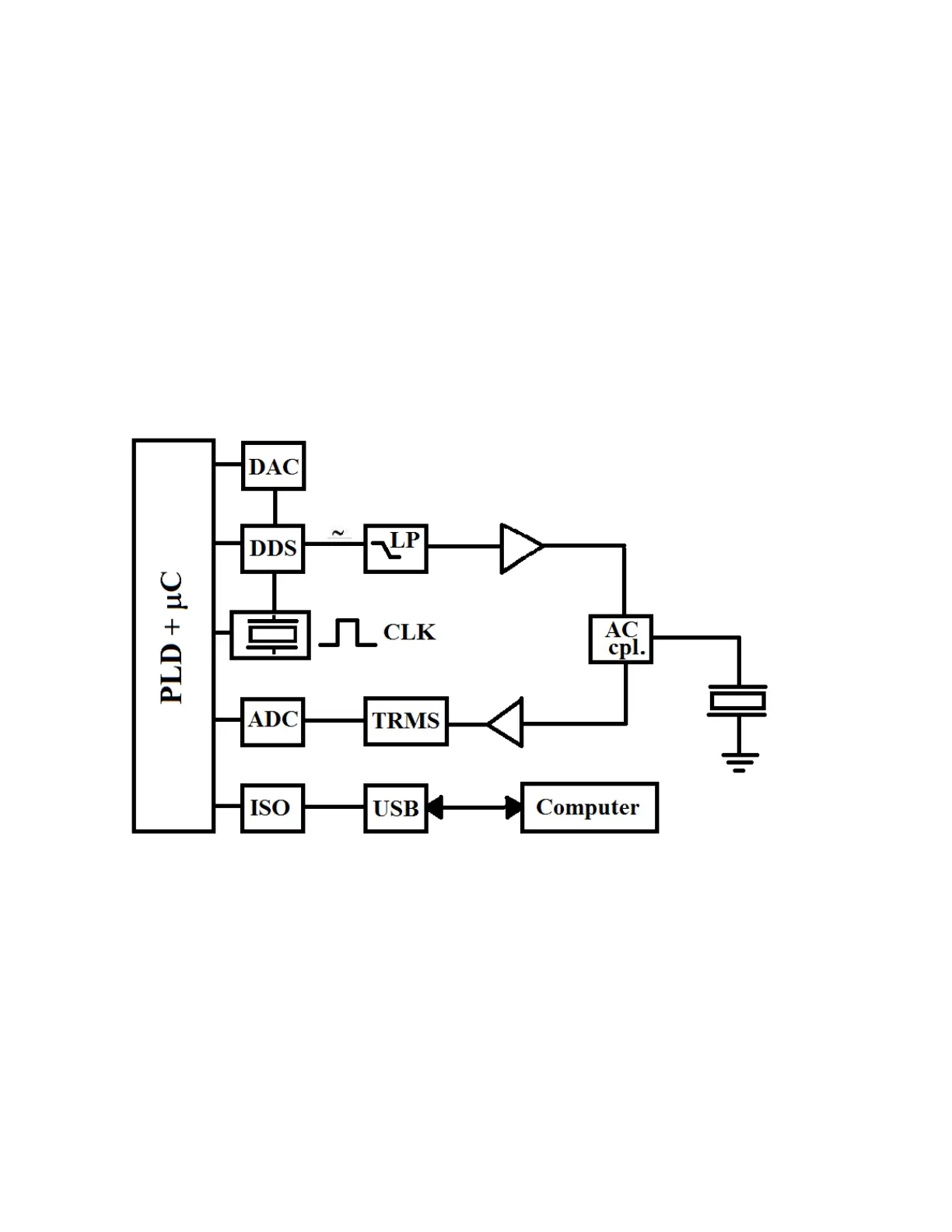 • The programmable logic device (PLD) acts as the core of the QCM. Sine waves of varying frequencies