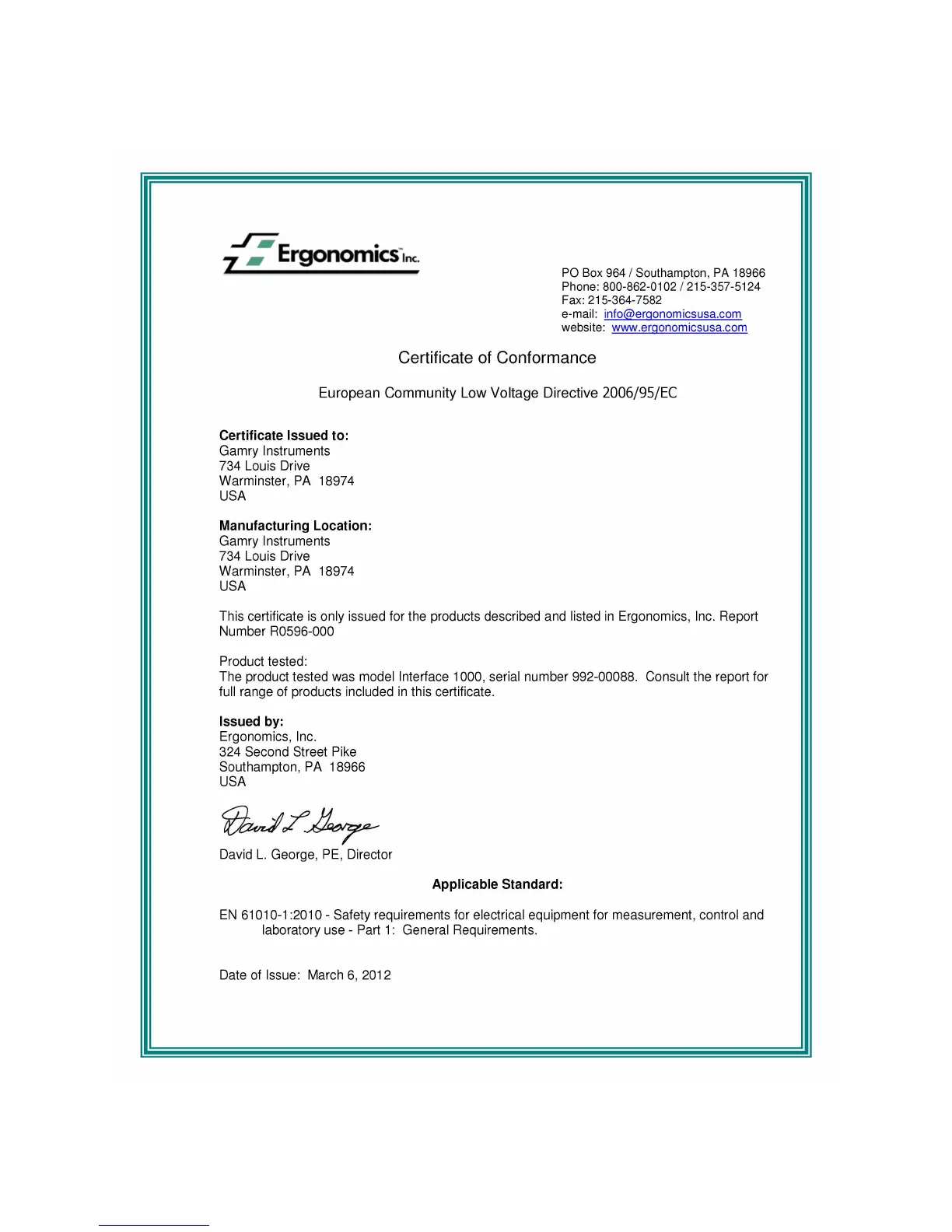 Gamry Interface 1000 - Low Voltage and RFI Certificates