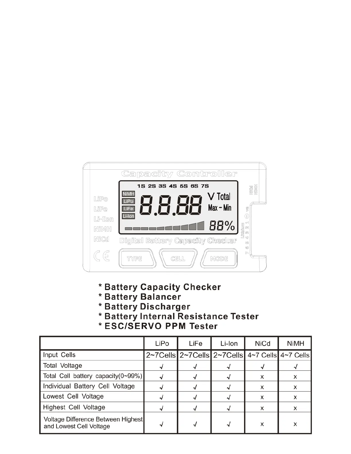 Plug the balancer cable of the battery into the battery tester. e tester will BEEP, and then show