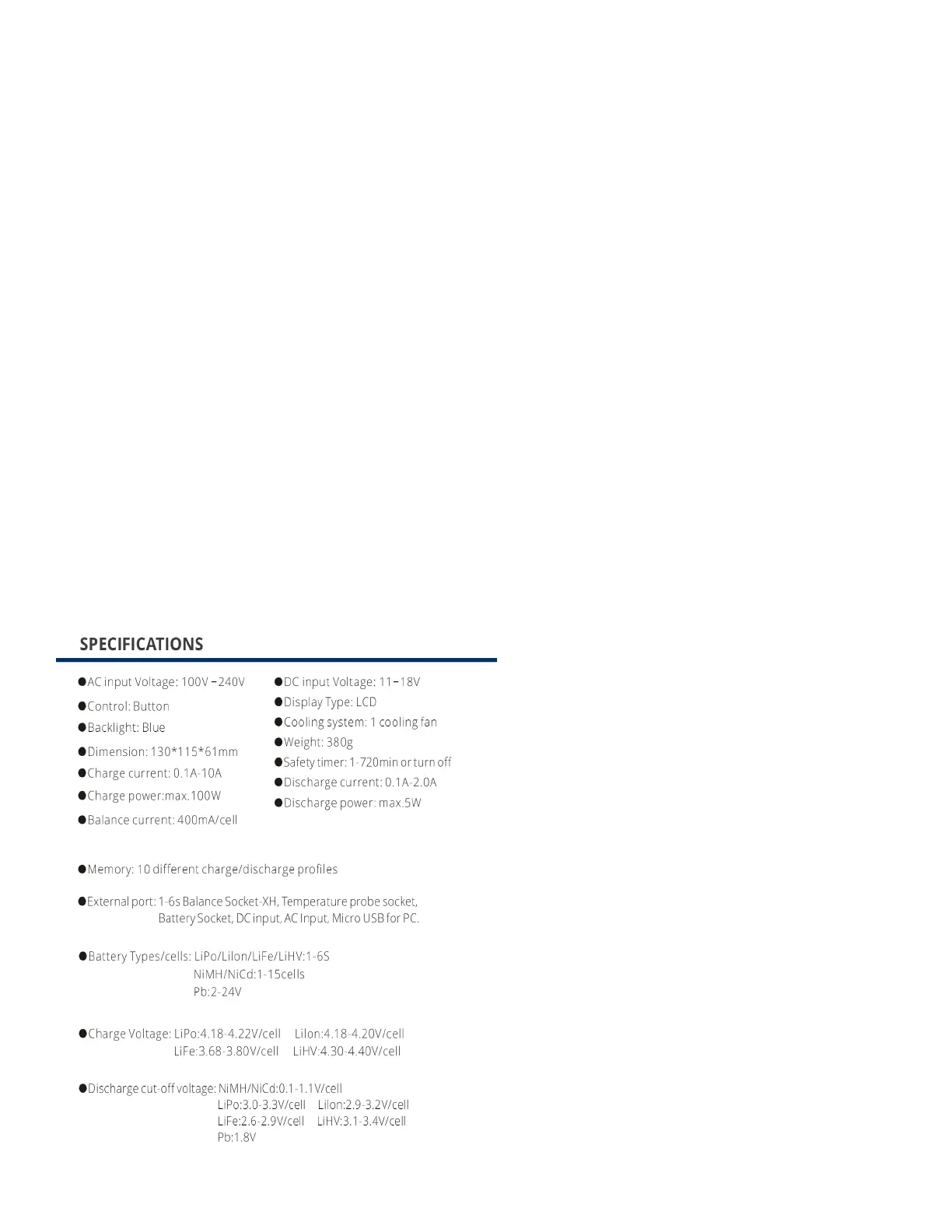100-240V AC input, suitable for use with LiPo / LiFe / LiHV / Li-lon / NiMH / NiCd / Pb