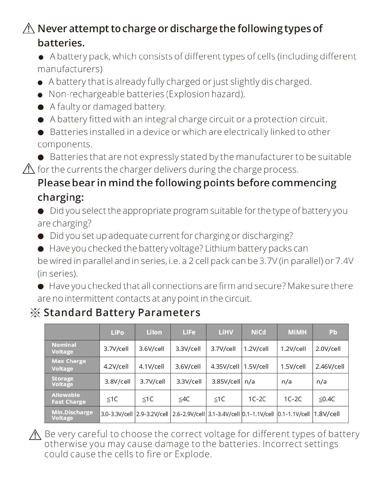Gannet Pro - Battery Charging and Discharging Warnings; Prohibited Battery Types and Precautions