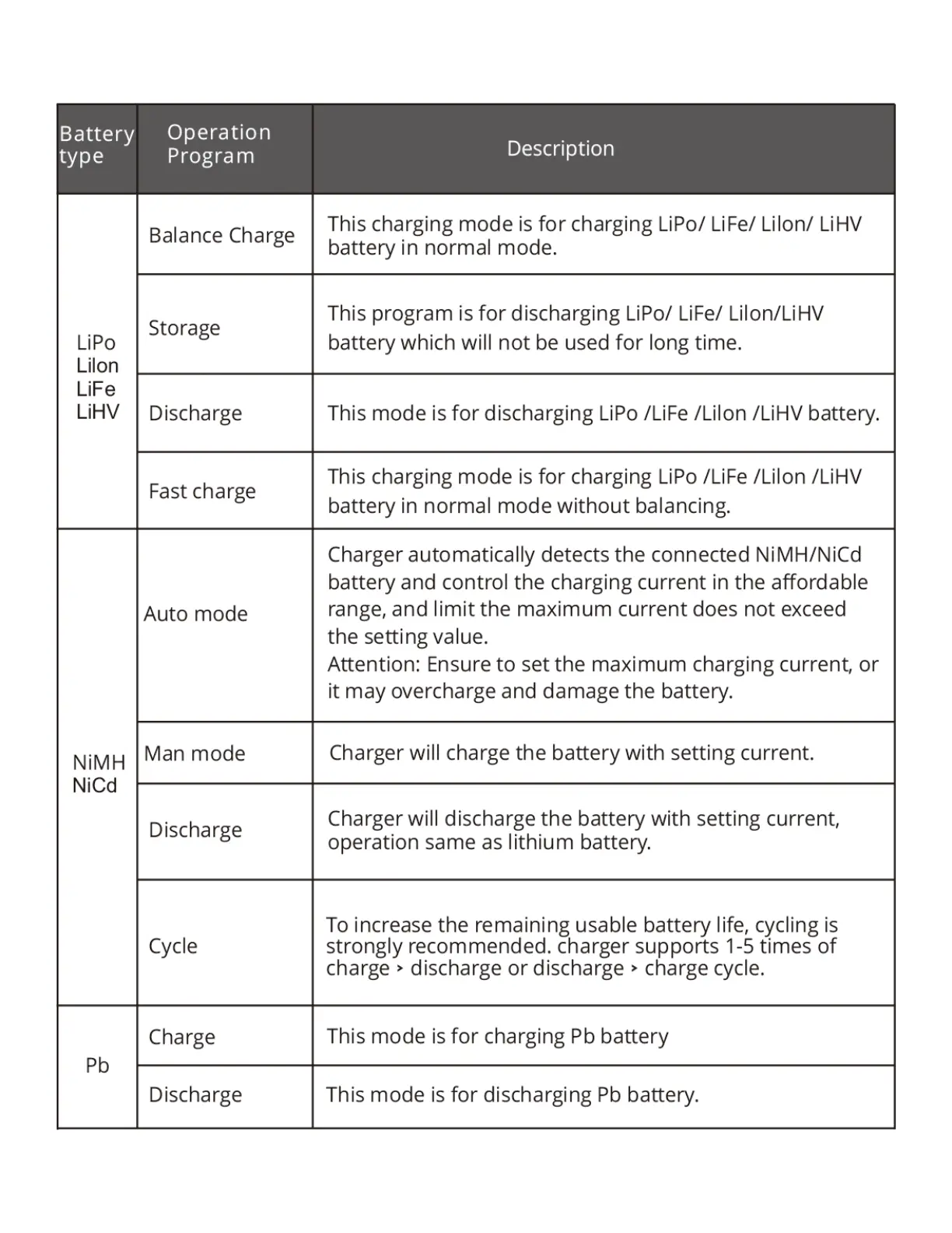 Gannet Pro - Battery Operation Programs; Program Descriptions by Battery Type