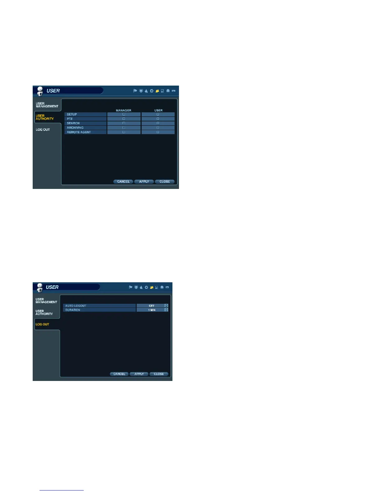 User can configure the specific authority and permissions for the MANAGER and USER groups.