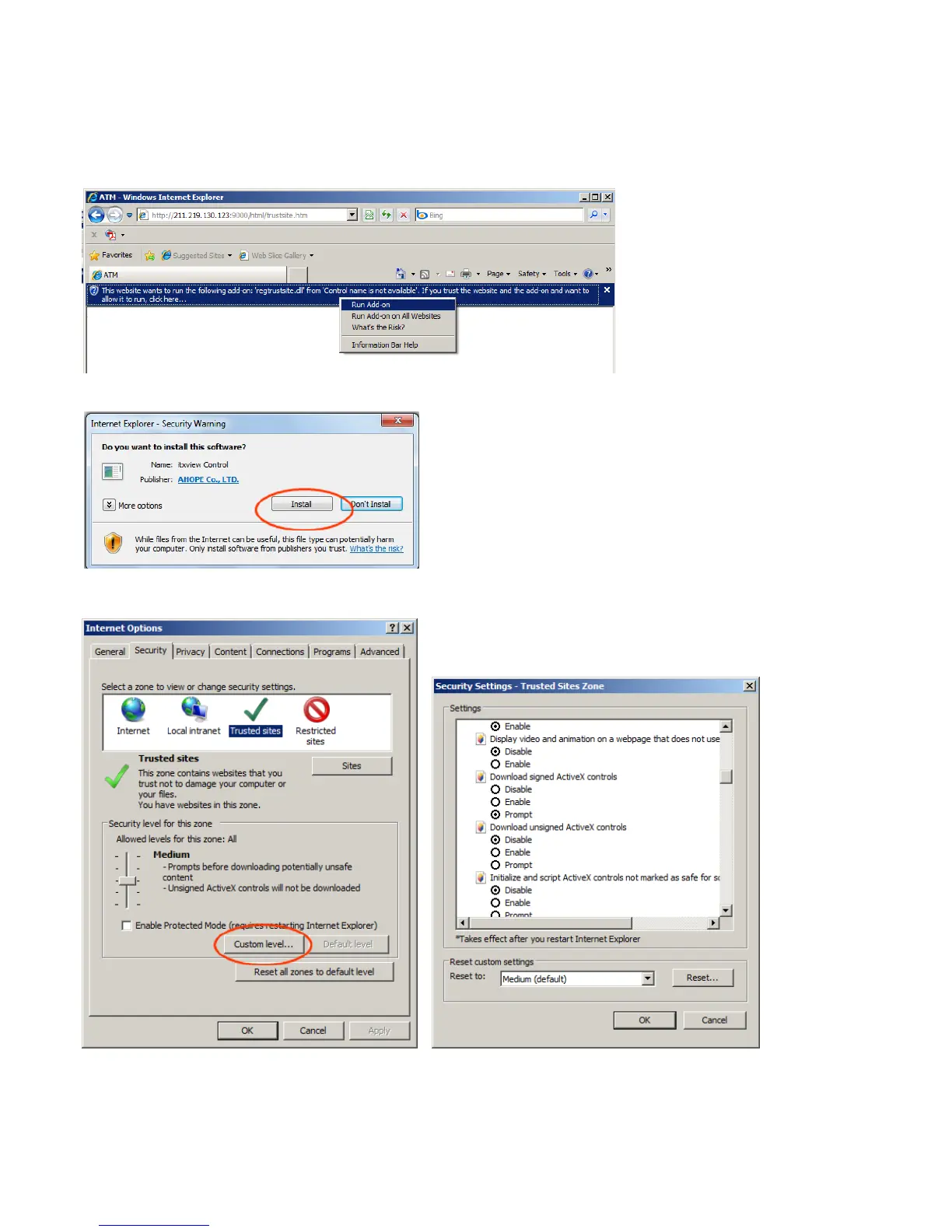 In case of not being able to install ActiveX, the user needs to enable ActiveX within the IE security menu.