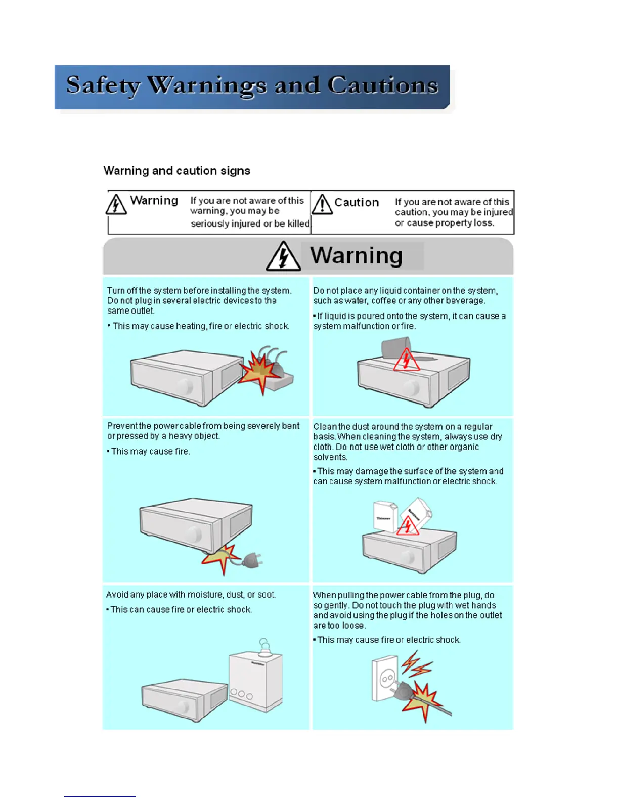 The following are warnings and precautions to ensure user safety and prevention of property damage.