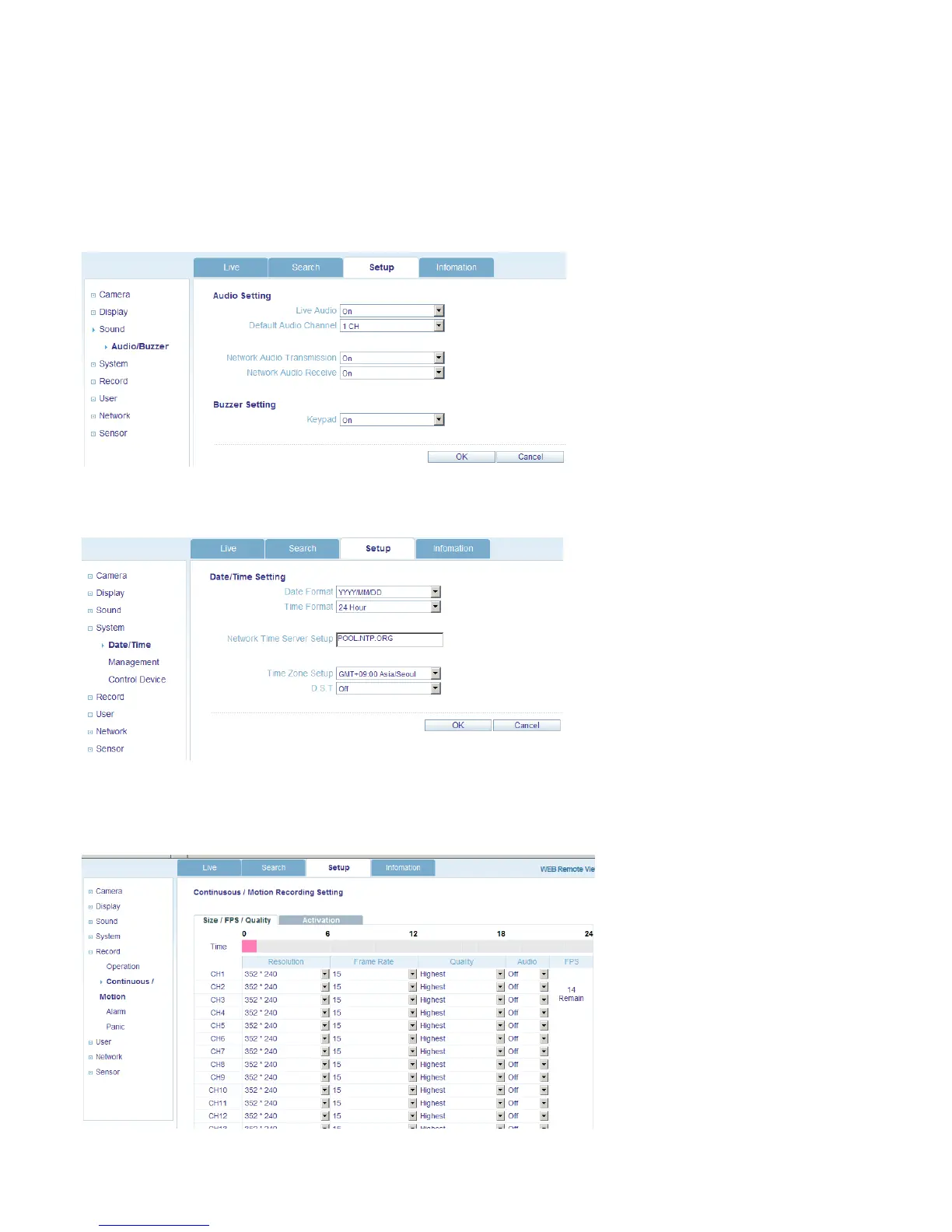 1) Audio Setting - Enable live audio, and select a live audio channel.