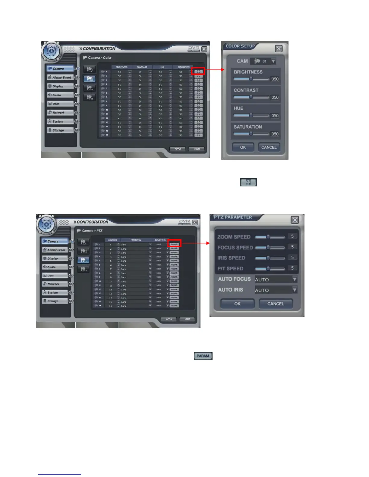 Camera color setup: Select the Brightness, Contrast, Tint and Color.