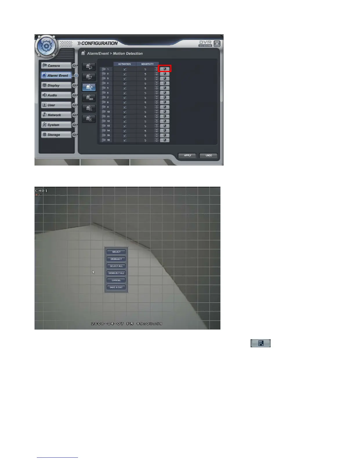 Select the Motion Detection, Activation, Sensitivity (1~10) and Motion Area.