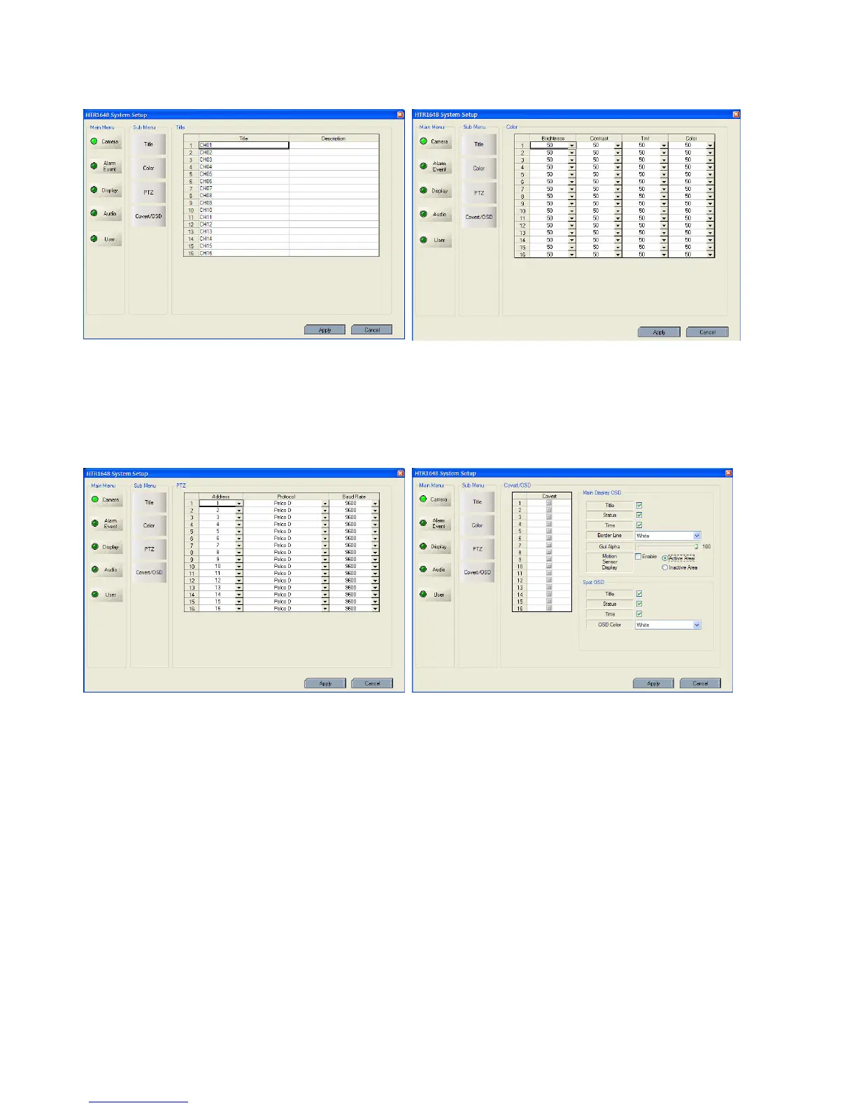 PTZ: Select the Address, Protocol, Baud Rate of each channel.
