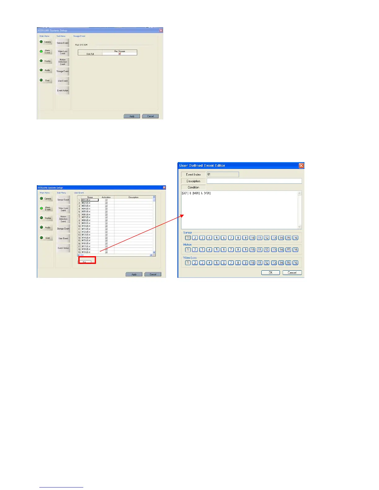 Select the Sensor, Motion, Video loss, Internal HDD, External HDD, and User Defined Event as user requires.