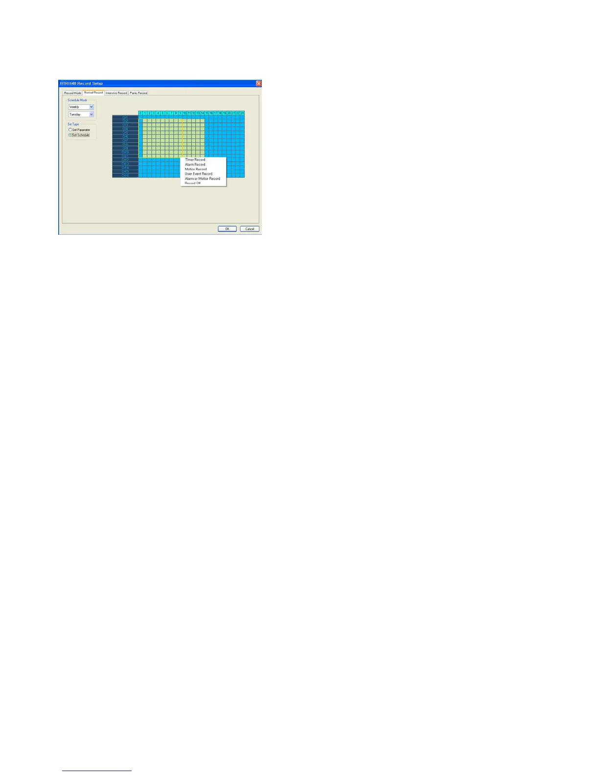 The operator can select recording type (Timer, Motion, Alarm, User Defined, Alarm or Motion and Record off) each