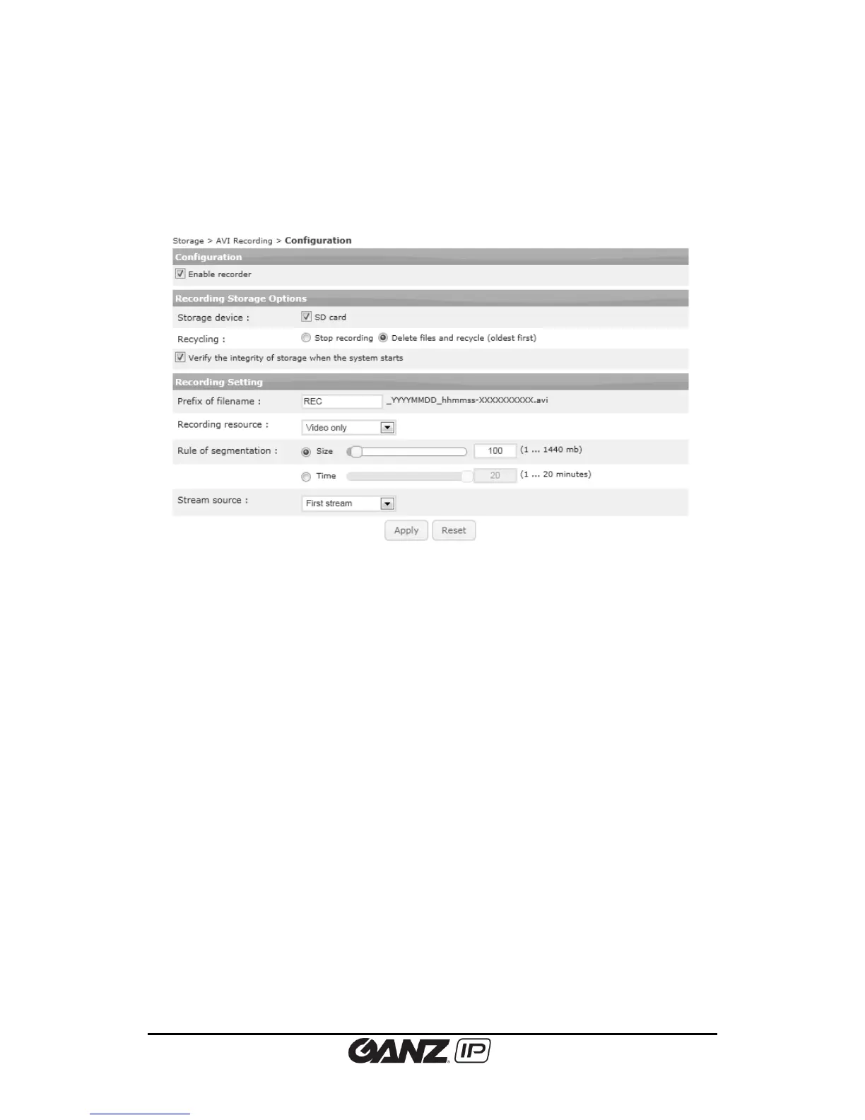 For the AVI recording configuration, click Storage > AVI Recording > Configuration. On this