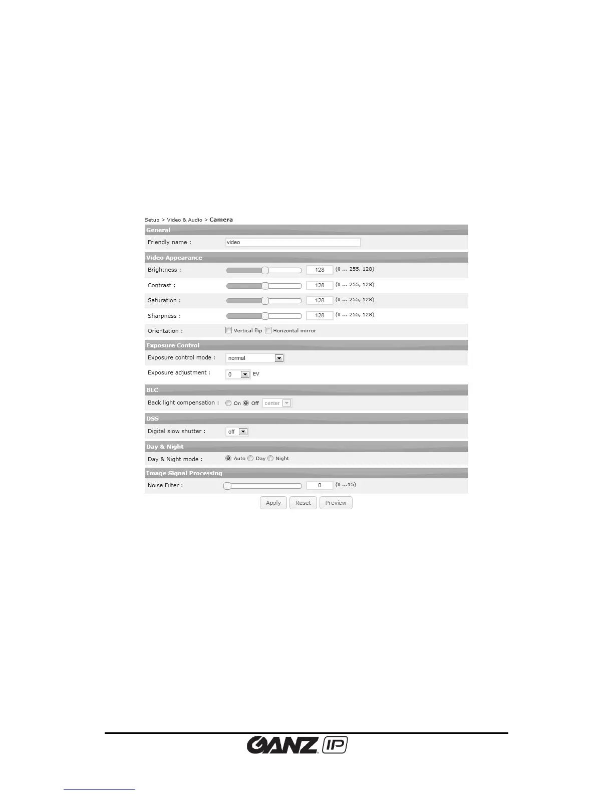 Camera section under the Video & Audio menu enables user to modify the camera image