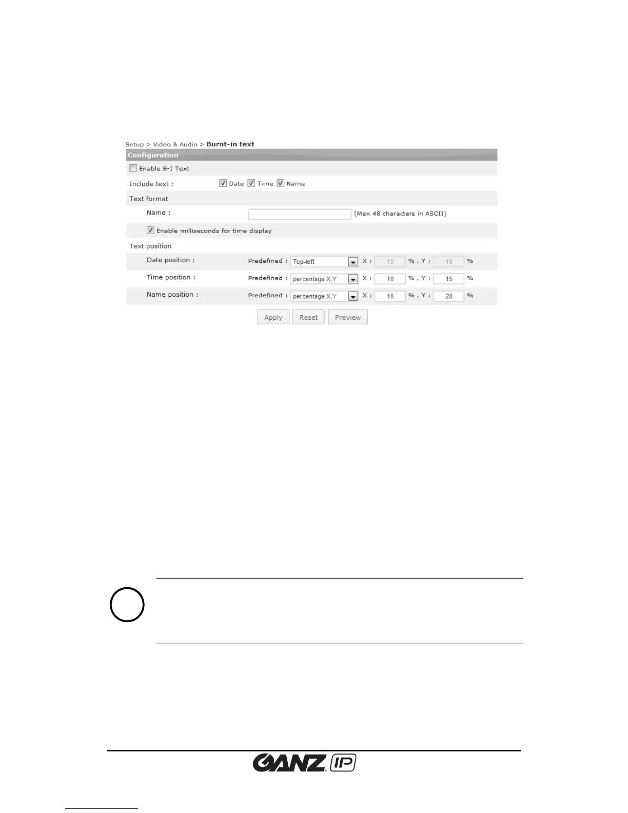 The setting of the Burnt-in Text is applied to first stream, second stream (if the device