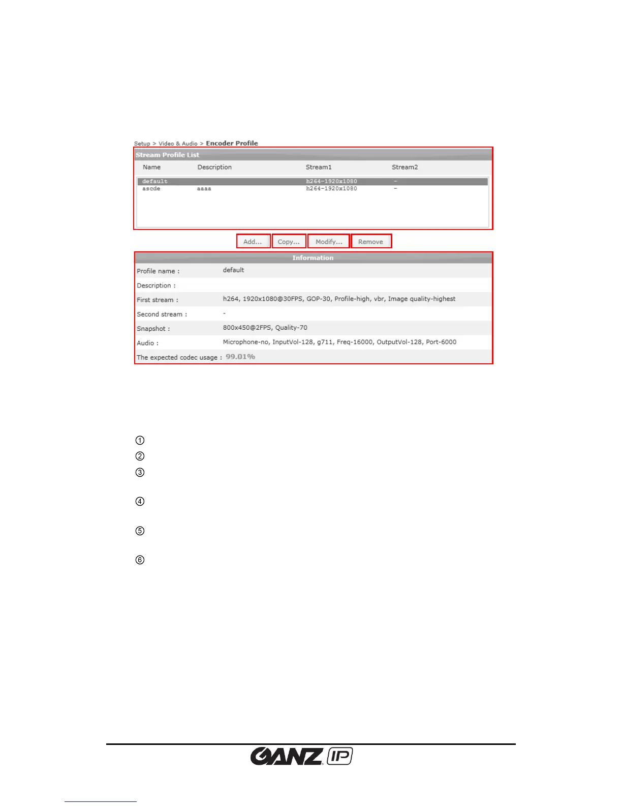 Stream Profile List: Lists the defined encoder profiles.