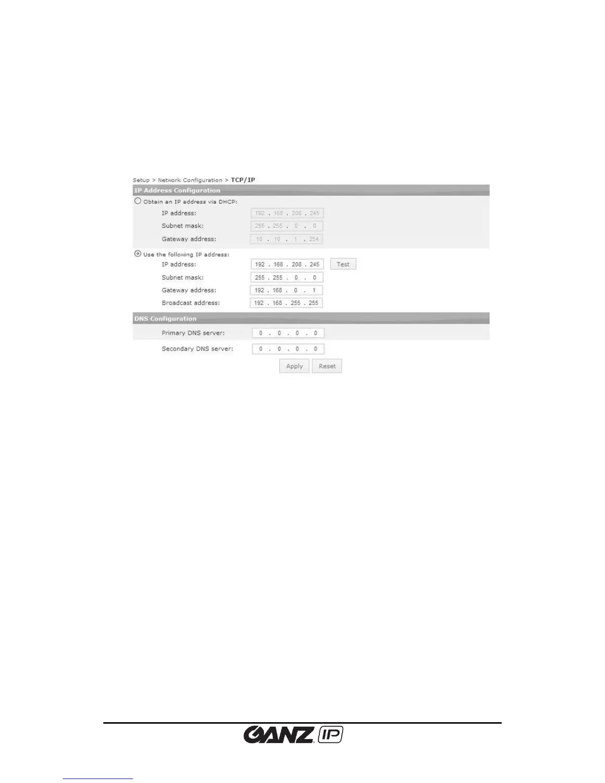 To change the TCP/IP setting, go to Setup > Basic Configuration > TCP/IP.