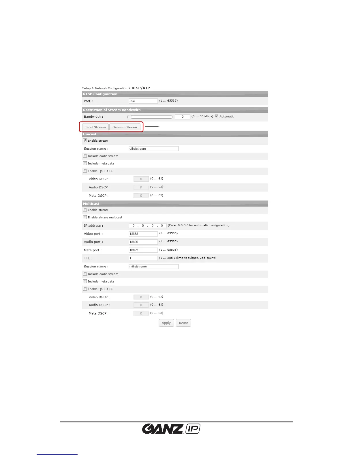 For the RTSP/RTP setting, go to Setup > Network Configuration > RTSP/RTP.