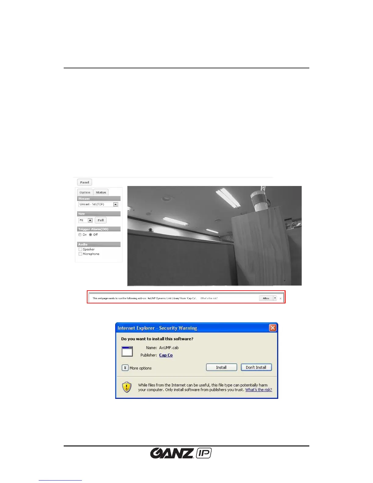 live streaming of the connected device. Installation of the ActiveX is required to see the live