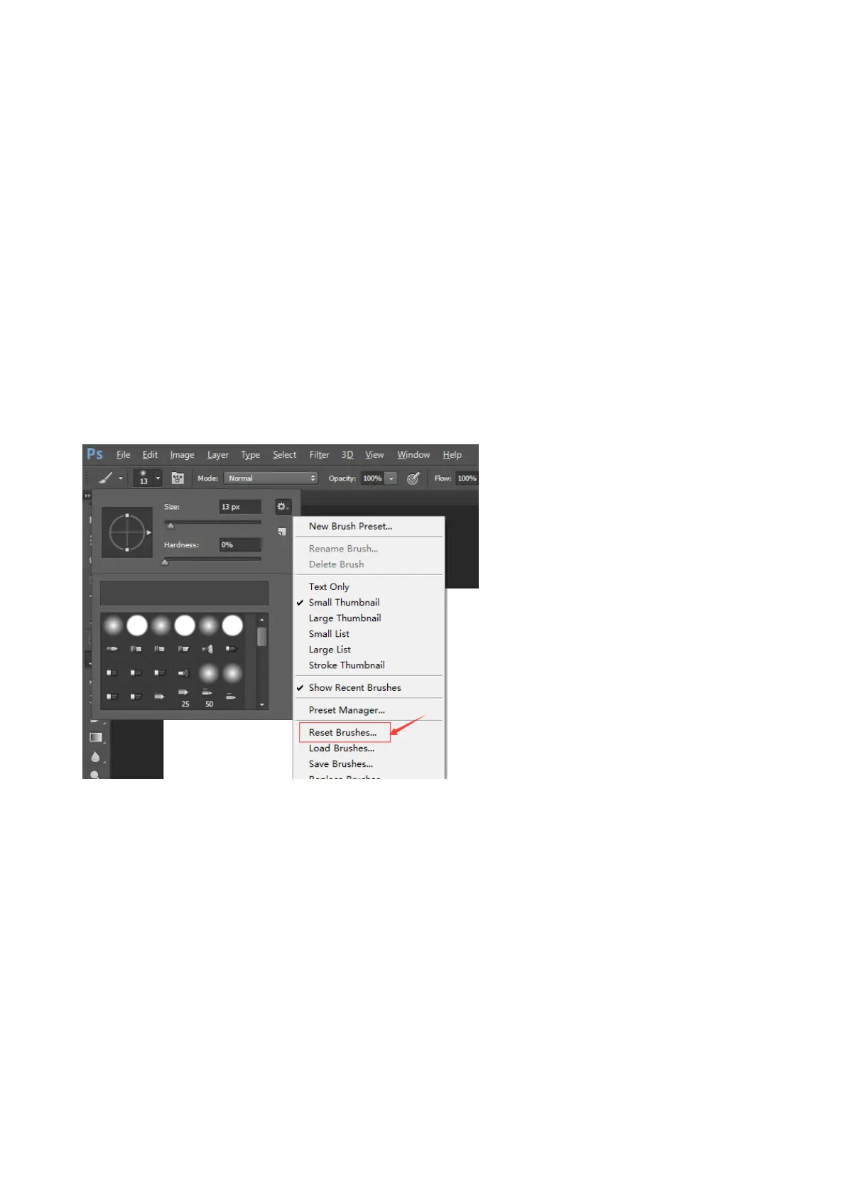 Step 4: click “Reset Brushes” in brush settings. (As following picture)